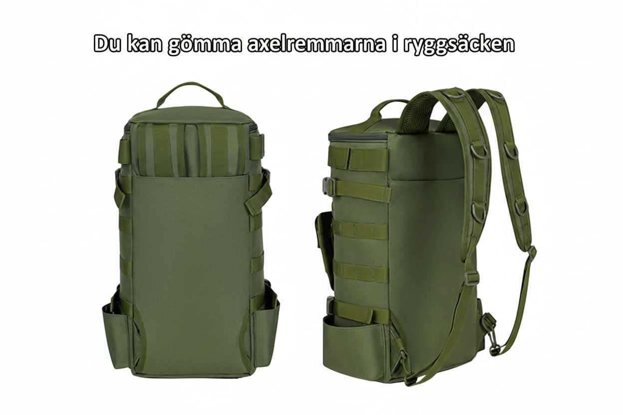 Den är gjord av vattentätt nylon som skyddar dina saker från regn och stänk. Den har stor förvaring, plats för allt du behöver och ett MOLLE‑system där du kan fästa extra utrustning. Den är lätt att bära, slitstark och funkar för fiske, vandring, camping och resor. Med denna ryggsäck får du ordning, trygghet och frihet att fokusera på det du älskar – att vara ute i naturen.